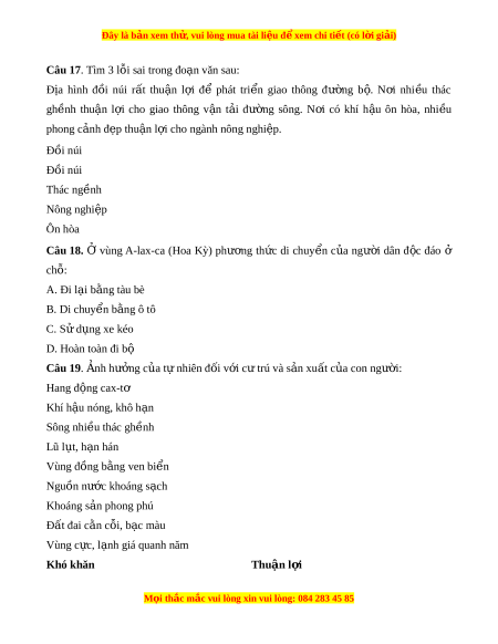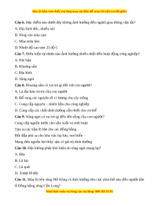 Câu 18. Ở vùng A-lax-ca (Hoa Kỳ) phư ng ơ th c ứ di chuy n ể c a ủ ngư i ờ dân đ c ộ đáo ở chỗ: A. Đi l i ạ b ng t ằ àu bè B. Di chuy n b ể ng ằ ô tô C. S d ử ng xe kéo ụ D. Hoàn toàn đi bộ Câu 19. nh h Ả ư ng ở c a t ủ nhi ự ên đối v i ớ cư trú và s n xu ả t ấ c a con ủ ngư i ờ : Hang đ ng cax- ộ tơ Khí h u ậ nóng, khô h n ạ Sông nhi u t ề hác gh nh ề Lũ l t ụ , h n hán ạ Vùng đồng b ng ằ ven bi n ể Nguồn nư c ớ khoáng s ch ạ Khoáng s n ả phong phú Đất đai c n ằ cỗi, b c m ạ àu Vùng c c, ự l nh gi ạ á quanh năm Khó khăn Thuận l i ợ M i ọ thắc m c
