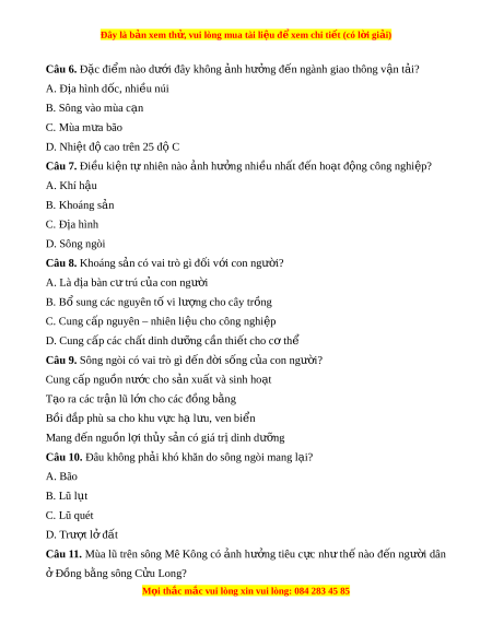 Đây là bản xem th , vu ử i lòng mua tài li u ệ đ xe ể m chi ti t (c ế ó l i ờ gi i ả ) Câu 6. Đặc đi m ể nào dư i ớ đây không nh h ả ư ng ở đ n ngành gi ế ao thông v n t ậ i ả ?