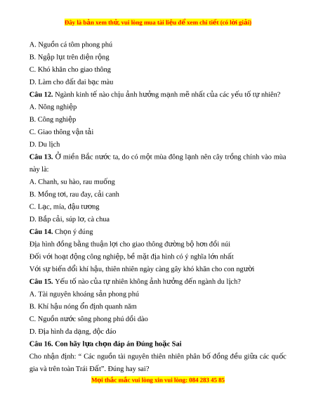 Câu 12. Ngành kinh tế nào ch u ị nh h ả ư ng ở m nh m ạ nh ẽ t ấ c a ủ các y u ế t t ố nhi ự ên? A. Nông nghi p ệ B. Công nghiệp C. Giao thông v n t ậ i ả D. Du lịch Câu 13. Ở mi n ề B c ắ nư c ớ ta, do có m t ộ mùa đông l nh ạ nên cây tr ng ồ chính vào mùa này là: A. Chanh, su hào, rau mu ng ố B. Mồng t i ơ , rau đay, c i ả canh C. L c, m ạ ía, đ u t ậ ư ng ơ D. B p c ắ i ả , súp l , ơ cà chua Câu 14. Ch n ọ ý đúng Địa hình đồng b ng t ằ hu n ậ l i ợ cho giao thông đư ng b ờ ộ h n đ ơ i ồ núi Đối v i ớ ho t ạ đ ng công nghi ộ p, b ệ m ề t ặ đ a hì ị nh có ý nghĩa l n nh ớ t ấ V i ớ s bi ự n đ ế ổi khí h u, t ậ