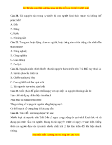 A. Địa hình dốc, nhi u núi ề B. Sông vào mùa c n ạ C. Mùa m a ư bão D. Nhi t ệ đ cao ộ trên 25 độ C Câu 7. Đi u ki ề ện t nhi ự ên nào nh h ả ư ng nhi ở u ề nh t ấ đ n ho ế t ạ đ ng công nghi ộ p? ệ A. Khí h u ậ B. Khoáng s n ả C. Địa hình D. Sông ngòi Câu 8. Khoáng s n ả có vai trò gì đ i ố v i ớ con ngư i ờ ? A. Là đ a bàn c ị t ư rú c a con ủ ngư i ờ