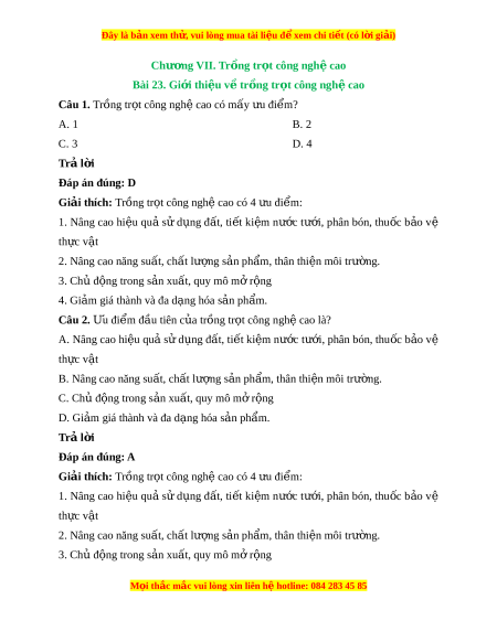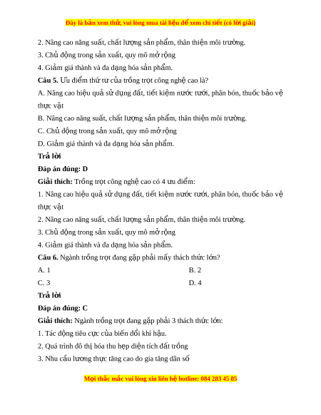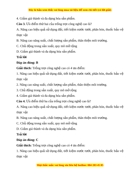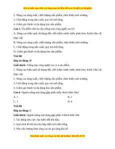 Đây là bản xem th , vu ử i lòng mua tài li u ệ đ xe ể m chi ti t (c ế ó l i ờ gi i ả ) 4. Gi m ả giá thành và đa d ng ạ hóa s n ả ph m ẩ . Câu 3. Ưu đi m ể th hai ứ c a ủ trồng tr t ọ công ngh cao l ệ à? A. Nâng cao hi u ệ qu ả s ử d ng ụ đ t ấ , ti t ế ki m ệ nư c ớ tư i ớ , phân bón, thu c ố b o ả vệ th c ự v t ậ B. Nâng cao năng su t ấ , ch t ấ lư ng ợ s n ả ph m ẩ , thân thi n m ệ ôi trư ng. ờ C. Ch đ ủ ng ộ trong s n xu ả t ấ , quy mô m r ở ng ộ D. Gi m ả giá thành và đa d ng ạ hóa s n ả ph m ẩ . Trả l i ờ Đáp án đúng: B