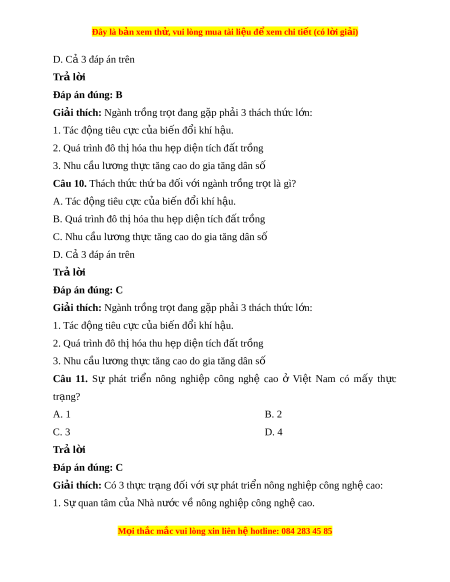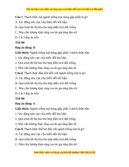 Đây là bản xem th , vu ử i lòng mua tài li u ệ đ xe ể m chi ti t (c ế ó l i ờ gi i ả ) Câu 7. Thách th c m ứ à ngành tr ng t ồ r t ọ đang g p ph ặ i ả là gì? A. Tác đ ng t ộ iêu c c c ự a ủ bi n đ ế i ổ khí h u. ậ B. Quá trình đô th hóa t ị hu h p di ẹ n t ệ ích đ t ấ tr ng ồ C. Nhu c u l ầ ư ng t ơ h c t