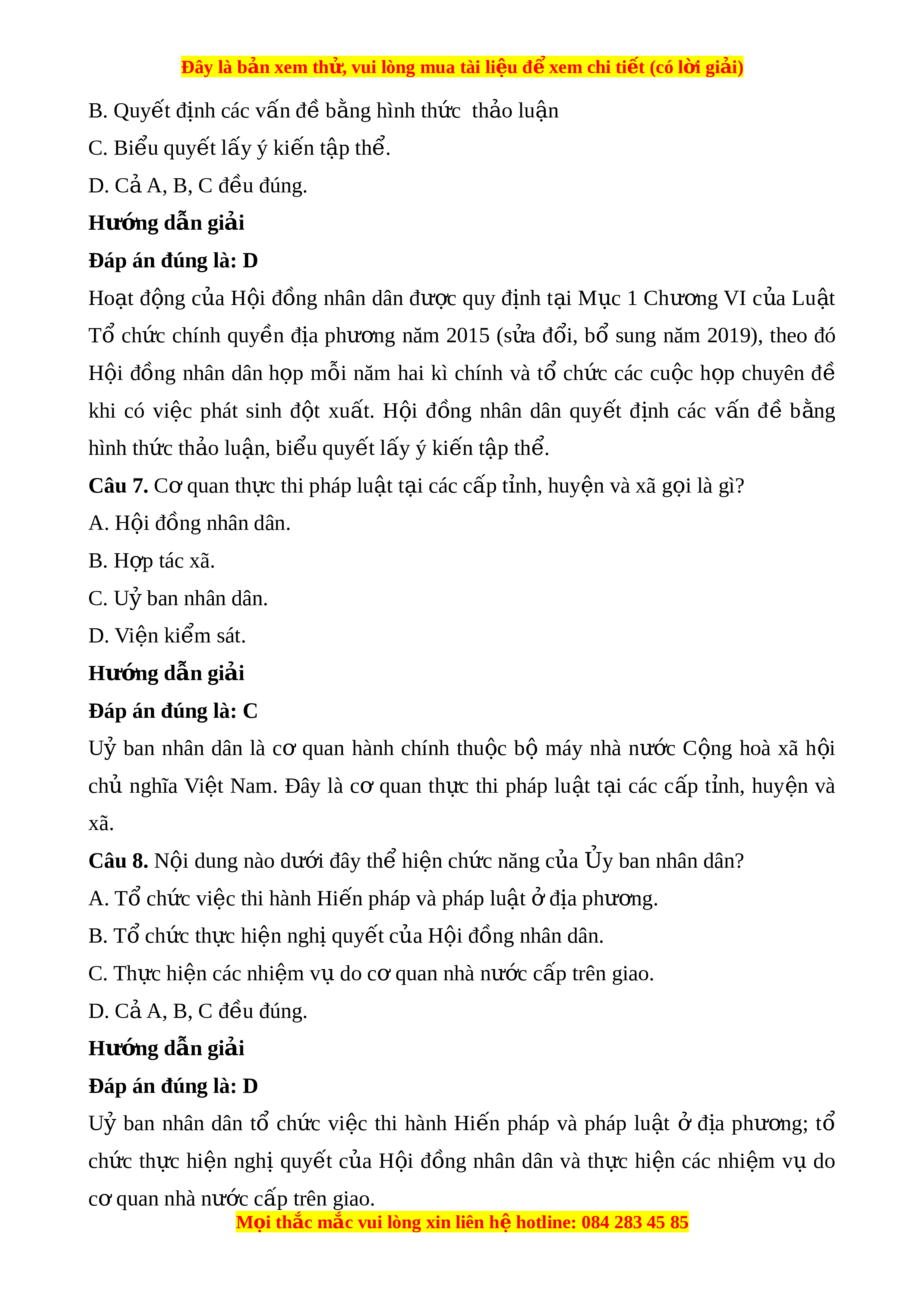 ọ mỗi năm hai kì chính và tổ ch c ứ các cu c ộ h p ọ chuyên đề khi có vi c ệ phát sinh đ t ộ xu t ấ . H i ộ đ ng ồ nhân dân quy t ế đ nh ị các v n ấ đề b ng ằ hình th c t ứ h o ả lu n, bi ậ u quy ể t ế l y ý ki ấ n t ế p ậ th . ể Câu 7. Cơ quan th c t ự hi pháp lu t ậ t i ạ các c p t ấ nh, huy ỉ n và xã g ệ i ọ là gì? A. H i ộ đồng nhân dân. B. H p t ợ ác xã. C. U ban nhân dân. ỷ D. Viện ki m ể sát. Hư ng d ớ ẫn gi i ả Đáp án đúng là: C