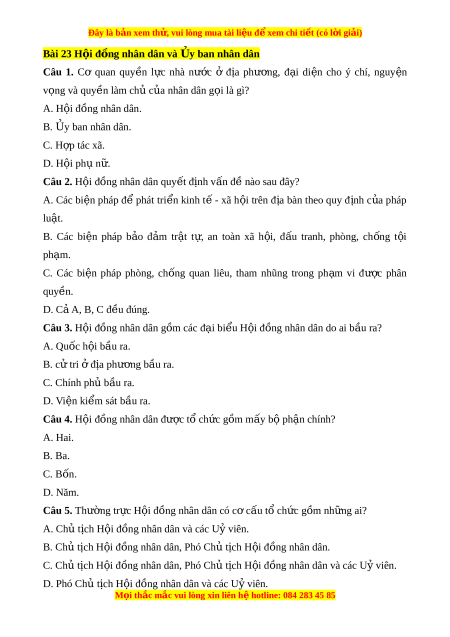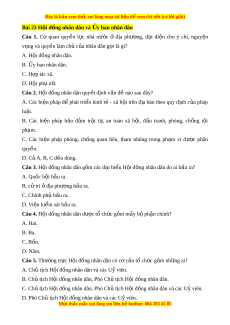 Đây là bản xem th , vu ử i lòng mua tài li u ệ đ xe ể m chi ti t ế (có l i ờ gi i ả ) Bài 23 H i ộ đ ng nhâ ồ n dân và y ban nhâ Ủ n dân Câu 1. Cơ quan quy n ề l c ự nhà nư c ớ ở đ a ị phư ng, ơ đ i ạ di n ệ cho ý chí, nguy n ệ v ng ọ và quy n l ề àm ch c ủ a ủ nhân dân g i ọ là gì? A. H i ộ đồng nhân dân. B. y ban nhân dân. Ủ C. H p t ợ ác xã. D. H i ộ ph n ụ . ữ Câu 2. H i ộ đồng nhân dân quy t ế đ nh v ị n đ ấ nào s ề au đây? A. Các bi n ệ pháp đ ể phát tri n ể kinh t ế - xã h i ộ trên đ a ị bàn theo quy đ nh ị c a ủ pháp lu t ậ . B. Các bi n ệ pháp b o ả đ m ả tr t ậ t , ự an toàn xã h i ộ , đ u ấ tranh, phòng, ch ng ố t i ộ ph m ạ . C. Các bi n ệ pháp phòng, ch ng
