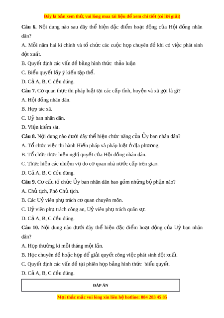 A. Mỗi năm hai kì chính và tổ ch c ứ các cu c ộ h p ọ chuyên đề khi có vi c ệ phát sinh đ t ộ xu t ấ . B. Quy t ế đ nh các v ị n đ ấ ề b ng ằ hình th c t ứ h o l ả u n ậ C. Bi u quy ể t ế l y ý ki ấ n t ế p t ậ h . ể D. C ả A, B, C đ u ề đúng. Câu 7. Cơ quan th c t ự hi pháp lu t ậ t i ạ các c p t ấ nh, huy ỉ n và xã g ệ i ọ là gì? A. H i ộ đồng nhân dân. B. H p t ợ ác xã. C. U ban nhân dân. ỷ D. Viện ki m ể sát. Câu 8. N i ộ dung nào dư i ớ đây th hi ể n ch ệ c ứ năng c a ủ y ban nhân Ủ dân? A. Tổ ch c ứ vi c t ệ hi hành Hi n ế pháp và pháp lu t ậ đ ở a ị phư ng. ơ B. T ch ổ c ứ th c hi ự n ngh ệ quy ị t ế c a H ủ i ộ đ ng nhân dân. ồ C. Th c hi ự n các nhi ệ m ệ v do c ụ ơ quan nhà nư c c ớ p t ấ rên giao. D. C ả A, B, C đ u ề đúng.