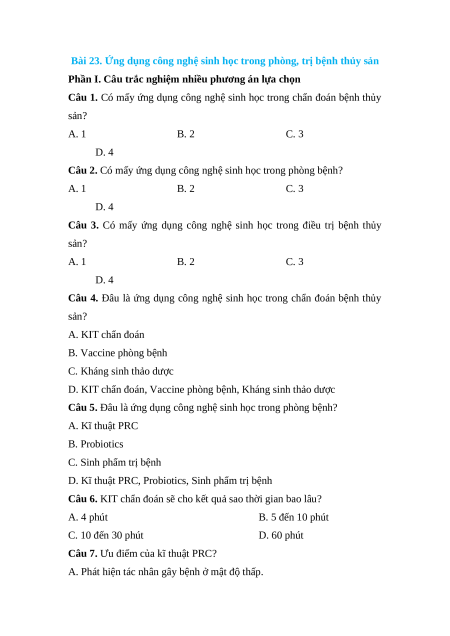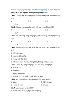 Câu 1. Có mấy ứng dụng công nghệ sinh học trong chẩn đoán bệnh thủy sản? A. 1 B. 2 C. 3 D. 4