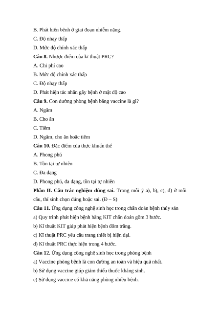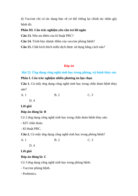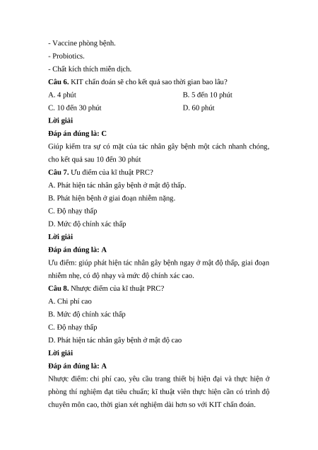 Câu 5. Đâu là ứng dụng công nghệ sinh học trong phòng bệnh? A. Kĩ thuật PRC B. Probiotics C. Sinh phẩm trị bệnh
