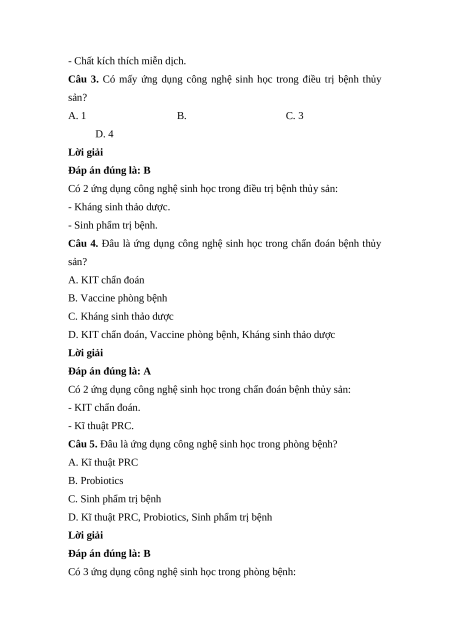 Câu 3. Có mấy ứng dụng công nghệ sinh học trong điều trị bệnh thủy sản? A. 1 B. 2 C. 3 D. 4