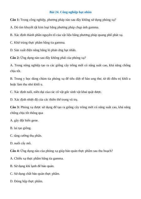 Câu 1: Trong công nghiệp, phương pháp nào sau đây không sử dụng phóng xạ?