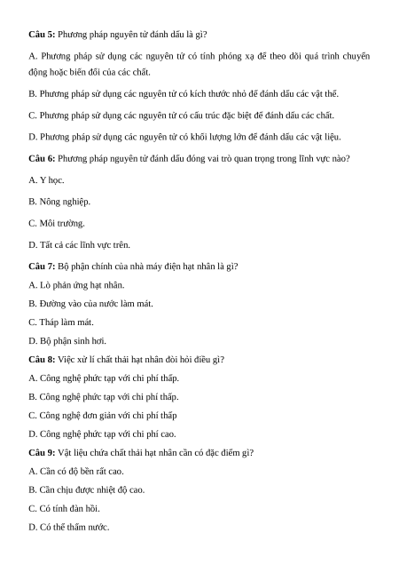 Câu 6: Phương pháp nguyên tử đánh dấu đóng vai trò quan trọng trong lĩnh vực nào? A. Y học. B. Nông nghiệp. C. Môi trường.