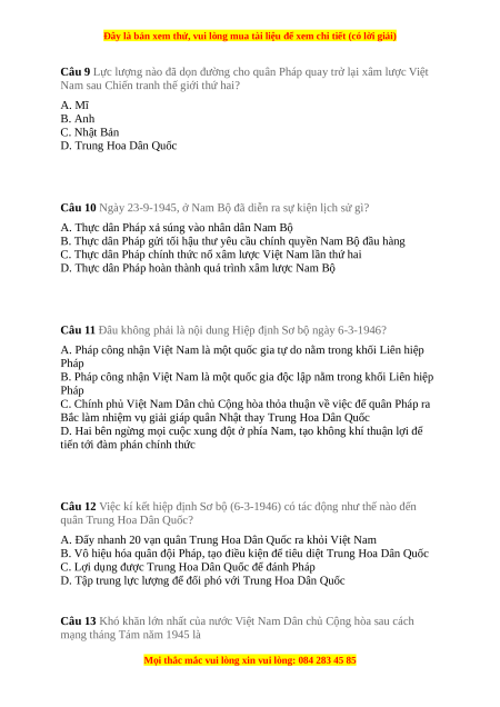 Câu 20 Đặc điểm mối quan hệ Việt- Pháp từ ngày 6-3 đến trước ngày 19-12-