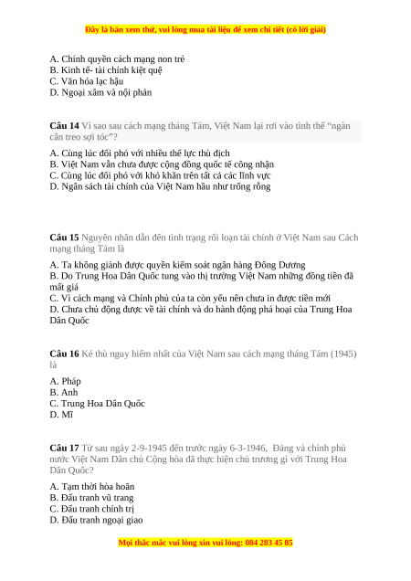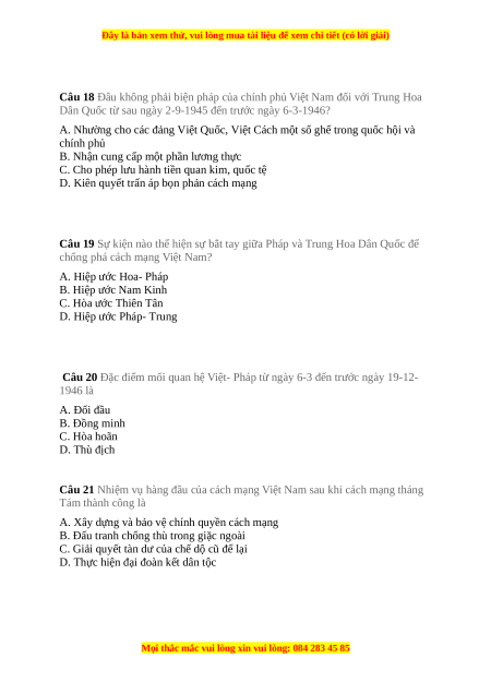 Câu 16 Kẻ thù nguy hiểm nhất của Việt Nam sau cách mạng tháng Tám (1945) là A. Pháp B. Anh C. Trung Hoa Dân Quốc D. Mĩ