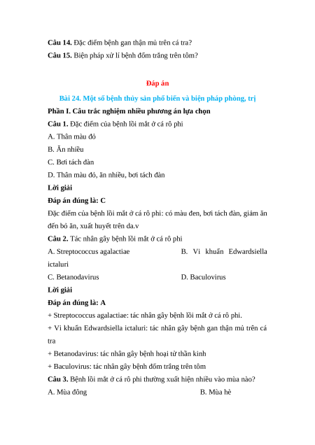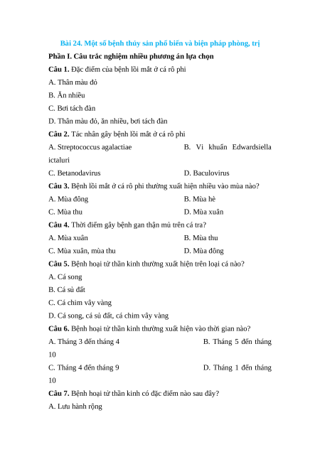 Câu 3. Bệnh lồi mắt ở cá rô phi thường xuất hiện nhiều vào mùa nào? A. Mùa đông B. Mùa hè C. Mùa thu D. Mùa xuân
