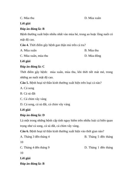 Câu 4. Thời điểm gây bệnh gan thận mủ trên cá tra? A. Mùa xuân B. Mùa thu C. Mùa xuân, mùa thu D. Mùa đông