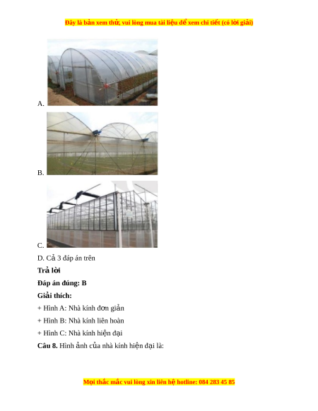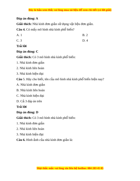 Đây là bản xem th , vu ử i lòng mua tài li u ệ đ xe ể m chi ti t (c ế ó l i ờ gi i ả ) A. B. C. D. C 3 đáp án ả trên Trả l i ờ Đáp án đúng: A Giải thích: + Hình A: Nhà kính đ n gi ơ n ả