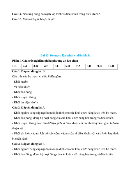 Câu 1. Cấu trúc của bo mạch vi điều khiển gồm mấy phần? A. 3 B. 5 C. 7 D. 9