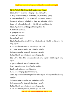 Bài 25. Vai trò, đặc đi m ể và các nhân t t ố ác đ ng… ộ Câu 1. Ti n b ế khoa h ộ c ọ - công nghệ nh ả hư ng đ ở n ế A. năng suất, s n l ả ư ng và ợ ch t ấ lư ng ợ s n ả ph m ẩ nông nghi p. ệ B. đi u t ề i t ế s n xu ả ất và nh ả hư ng đ ở n t ế ính chuyên môn hóa. C. s phân ự bố và quy mô c a ủ ho t ạ đ ng ộ s n ả xu t ấ nông nghi p. ệ D. quy mô, hi u qu ệ ả s n ả xu t ấ và thúc đ y s ẩ n ả xu t ấ hàng hóa. Câu 2. Nguồn th c ứ ăn không nh ả hư ng nhi ở u đ ề n ế