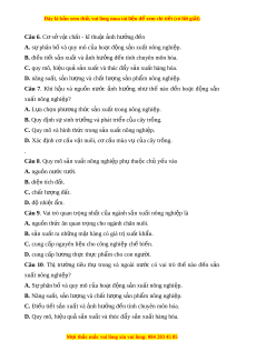 Câu 14. Nguồn nư c ng ớ t ọ nh ả hư ng t ở r c t ự i p đ ế n ế A. đi u t ề i t ế s n ả xu t ấ và nh h ả ư ng ở đ n t ế ính chuyên môn hóa. B. quy mô, hi u qu ệ s ả n xu ả t ấ và thúc đ y s ẩ n xu ả t ấ hàng hóa. C. năng suất, s n l ả ư ng và ợ ch t ấ lư ng ợ s n ả ph m ẩ nông nghi p. ệ D. s phân ự bố và quy mô c a ủ ho t ạ đ ng ộ s n ả xu t ấ nông nghi p. ệ Câu 15. N n nông nghi ề ệp s n ả xu t ấ hàng hóa có bi u hi ể n nào s ệ au đây? A. Đẩy m nh s ạ n xu ả ất qu ng canh ả đ không ng ể ng t ừ ăng s n ả xu t ấ . B. T p t ậ rung vào s n ả xu t ấ các s n ph ả m ẩ ph c v ụ nhu c ụ u t ầ rong nư c. ớ C. S d ử ng nhi ụ u l ề ao đ ng và ộ công c t ụ h công vào t ủ rong s n ả xu t ấ .