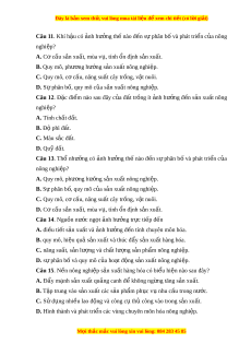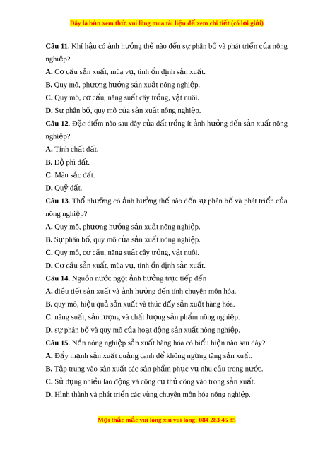 Đây là bản xem th , vu ử i lòng mua tài li u ệ đ xe ể m chi ti t ế (có l i ờ gi i ả ) Câu 11. Khí h u có ậ nh ả hư ng t ở h nào ế đ n s ế phân ự b và phát ố tri n c ể a ủ nông nghiệp? A. C c ơ ấu s n xu ả ất, mùa v , t ụ ính n đ ổ nh s ị n ả xu t ấ . B. Quy mô, phư ng ơ hư ng s ớ n xu ả t ấ nông nghi p. ệ C. Quy mô, c c