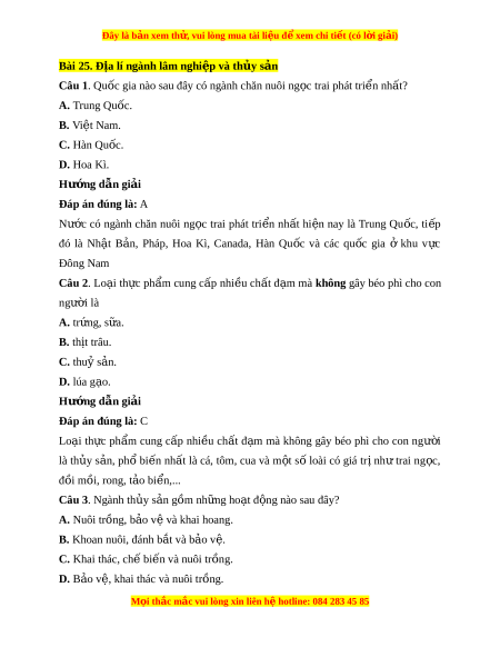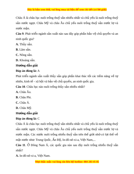 ọ . Châu Mỹ và châu Âu chủ y u ế nuôi tr ng ồ thuỷ s n ả nư c ớ lợ và nư c ớ m n. ặ Câu 9. Phát tri n ể ngành s n ả xu t ấ nào sau đây góp ph n ầ b o ả v ệ ch ủ quy n ề và an ninh quốc gia? A. Th y s ủ n. ả B. Lâm s n. ả C. Nông s n. ả D. Khoáng s n. ả Hư ng d ớ ẫn gi i ả Đáp án đúng là: A Phát tri n ể ngành s n ả xu t ấ th y ủ s n ả góp ph n ầ khai thác t t ố các ti m ề năng về tự nhiên, kinh t - ế xã h i ộ và b o ả v ch ệ quy ủ n, an ni ề nh qu c gi ố a.