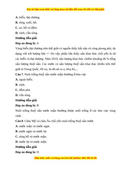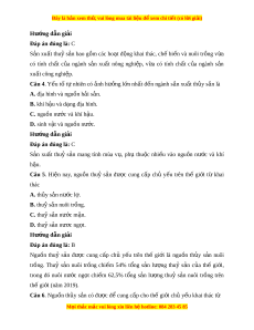 A. địa hình và nguồn h i ả s n. ả B. khí h u và d ậ ng ạ đ a hì ị nh. C. nguồn nư c ớ và khí h u. ậ D. sinh v t ậ và nguồn nư c. ớ Hư ng d ớ ẫn gi i ả Đáp án đúng là: C S n ả xu t ấ thuỷ s n ả mang tính mùa v , ụ phụ thu c ộ nhi u ề vào ngu n ồ nư c ớ và khí h u. ậ Câu 5. Hi n ệ nay, ngu n ồ thuỷ s n ả đư c ợ cung c p ấ chủ y u ế trên thế gi i ớ từ khai thác A. th y s ủ n n ả ư c ớ l . ợ B. thu s ỷ n ả nuôi tr ng. ồ C. thu s ỷ n n ả ư c ớ m n. ặ D. thu s ỷ n n ả ư c ơ ng t ọ . Hư ng d ớ ẫn gi i ả Đáp án đúng là: B Nguồn thuỷ s n ả đư c ợ cung c p ấ chủ y u ế trên thế gi i ớ là ngu n ồ th y ủ s n ả nuôi trồng. Thuỷ s n ả nuôi tr ng ồ chi m ế 54% t ng ổ s n ả lư ng ợ thuỷ s n ả c a ủ thế gi i ớ , trong đó nuôi nư c ớ ng t ọ chi m ế 62,5% t ng ổ s n ả lư ng ợ thuỷ s n ả nuôi tr ng ồ trên th gi ế i ớ (năm 2019). Câu 6. Nguồn th y s ủ n có đ ả ư c ợ đ cung c ể p cho t ấ h gi ế i ớ chủ y u khai ế thác từ M i