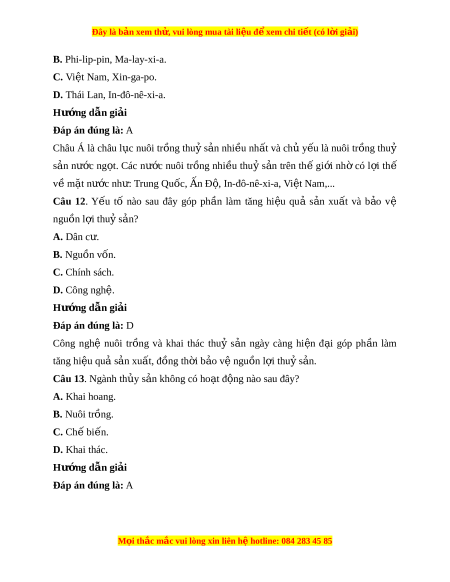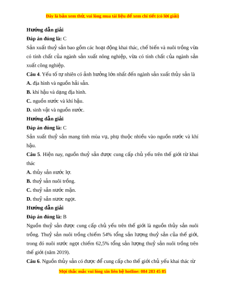 Đây là bản xem th , vu ử i lòng mua tài li u ệ đ xe ể m chi ti t (c ế ó l i ờ gi i ả ) Hư ng d ớ ẫn gi i ả Đáp án đúng là: C S n ả xu t ấ thuỷ s n ả bao g m ồ các ho t ạ đ ng ộ khai thác, ch ế bi n ế và nuôi tr ng ồ v a ừ có tính ch t ấ c a ủ ngành s n ả xu t ấ nông nghi p, ệ v a ừ có tính ch t ấ c a ủ ngành s n ả xuất công nghi p. ệ Câu 4. Y u t ế ố t nhi ự ên có nh ả hư ng l ở n nh ớ t ấ đ n ngành s ế n xu ả t ấ th y s ủ n l ả à