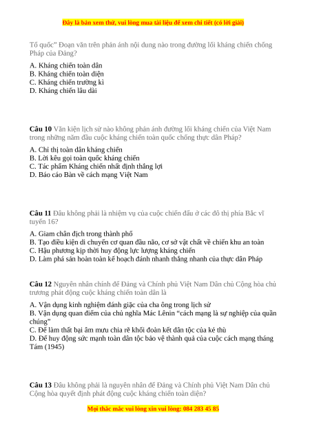 Tổ quốc” Đoạn văn trên phản ánh nội dung nào trong đường lối kháng chiến chống Pháp của Đảng? A. Kháng chiến toàn dân B. Kháng chiến toàn diện