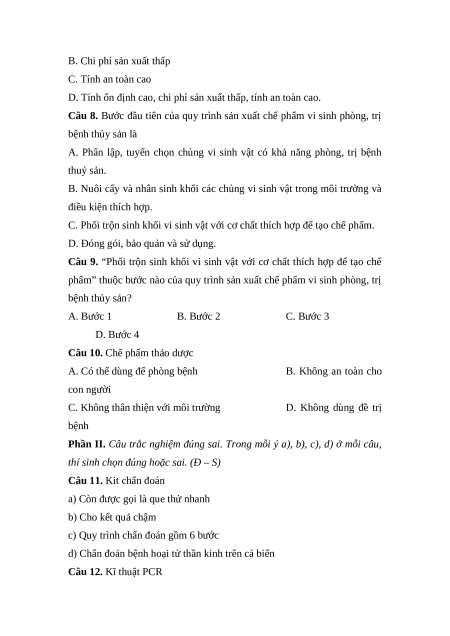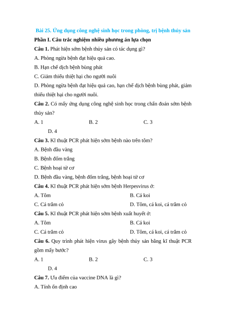 Câu 3. Kĩ thuật PCR phát hiện sớm bệnh nào trên tôm? A. Bệnh đầu vàng B. Bệnh đốm trắng C. Bệnh hoại tử cơ