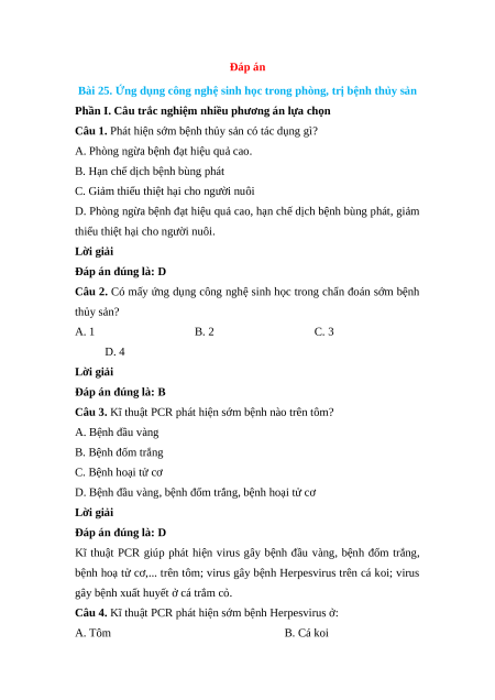 Câu 5. Kĩ thuật PCR phát hiện sớm bệnh xuất huyết ở: A. Tôm B. Cá koi C. Cá trắm cỏ