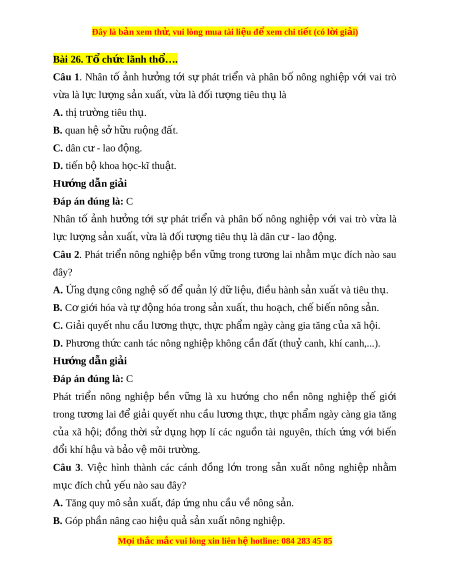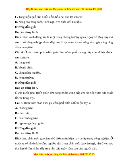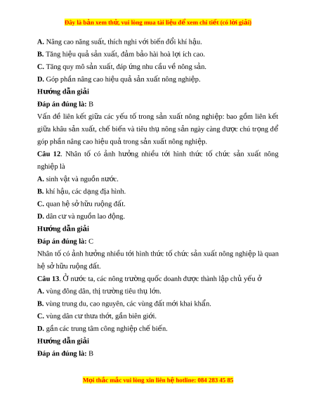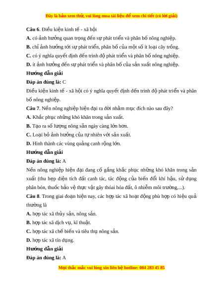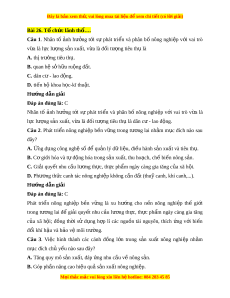 Đây là bản xem th , vu ử i lòng mua tài li u ệ đ xe ể m chi ti t (c ế ó l i ờ gi i ả ) Câu 6. Đi u ki ề n ki ệ nh t - ế xã h i ộ A. có nh ả hư ng quan ở tr ng đ ọ n s ế phát ự tri n và phân b ể nông nghi ố p. ệ B. chỉ nh h ả ư ng ở t i ớ s phát ự tri n, phân b ể ố c a m ủ t ộ số ít lo i ạ cây tr ng. ồ C. có ý nghĩa quy t ế đ nh đ ị n ế trình đ phát ộ tri n và phân b ể nông nghi ố p. ệ D. ít nh ả hư ng đ ở n s ế ự phát tri n ể và phân b c ố a s ủ n xu ả t ấ nông nghi p. ệ Hư ng d ớ ẫn gi i ả Đáp án đúng là: C Đi u ề ki n ệ kinh tế - xã h i ộ có ý nghĩa quy t ế đ nh ị đ n ế trình đ ộ phát tri n ể và phân bố nông nghi p. ệ Câu 7. N n ề nông nghi p hi ệ n đ ệ i ạ ra đ i ờ nh m ằ m c đí ụ ch nào sau đây? A. Khắc ph c nh ụ ng ữ khó khăn trong s n xu ả t ấ . B. T o r ạ a số lư ng nông s ợ n ngày càng ả l n h ớ n. ơ C. Lo i ạ b ỏ nh ả hư ng c ở a ủ t nhi ự ên v i ớ s n xu ả t ấ .