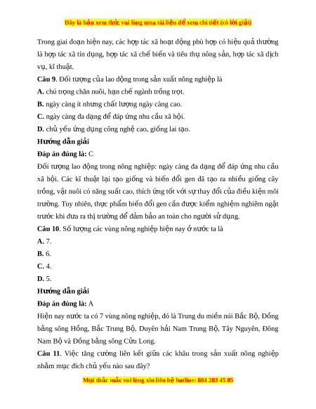 Đây là bản xem th , vu ử i lòng mua tài li u ệ đ xe ể m chi ti t (c ế ó l i ờ gi i ả ) Trong giai đo n ạ hi n ệ nay, các h p ợ tác xã ho t ạ đ ng ộ phù h p ợ có hi u ệ qu ả thư ng ờ là h p ợ tác xã tín d ng, ụ h p ợ tác xã ch ế bi n ế và tiêu th ụ nông s n, ả h p ợ tác xã d ch ị v , kĩ ụ thu t ậ . Câu 9. Đối tư ng c ợ a ủ lao đ ng t ộ rong s n ả xu t ấ nông nghi p l ệ à A. chú tr ng chăn ọ nuôi, h n ạ ch ngành t ế r ng t ồ r t ọ .