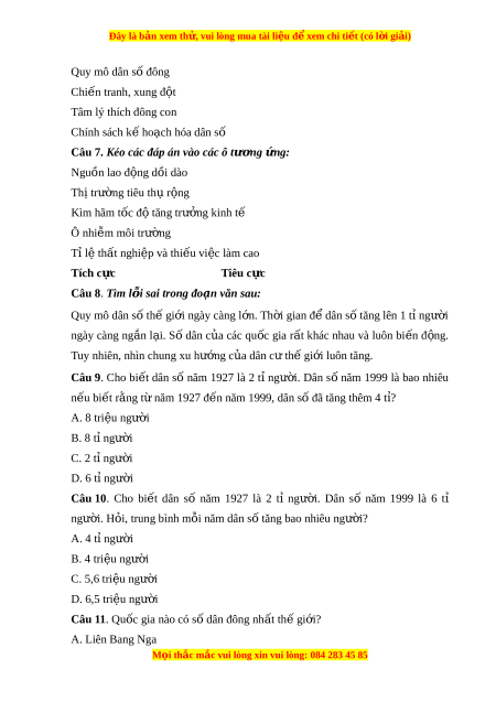 Đây là bản xem th , vu ử i lòng mua tài li u ệ đ xe ể m chi ti t ế (có l i ờ gi i ả ) Quy mô dân số đông Chi n t ế ranh, xung đ t ộ Tâm lý thích đông con Chính sách k ho ế ch ạ hóa dân số