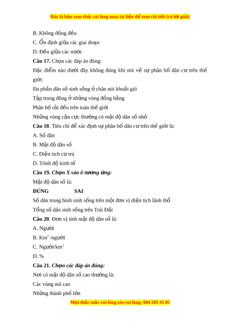 Câu 18. Tiêu chí đ xác đ ể nh s ị phân ự b dân c ố ư trên thế gi i ớ là: A. Số dân B. M t ậ đ dân ộ số C. Di n t ệ ích c t ư rú D. Trình độ kinh tế Câu 19. Ch n X ọ vào ô tư ng ơ ng: ứ M t ậ đ dân s ộ ố là: ĐÚNG SAI