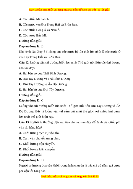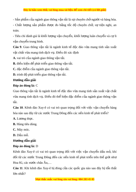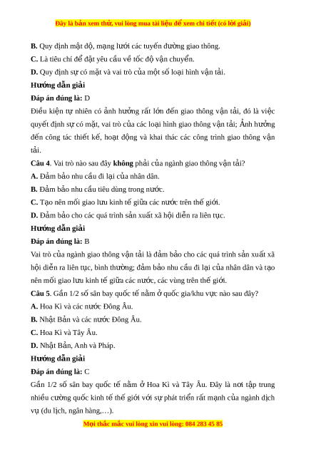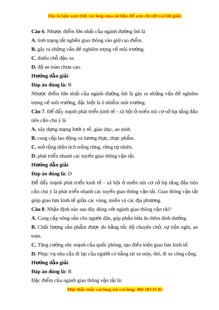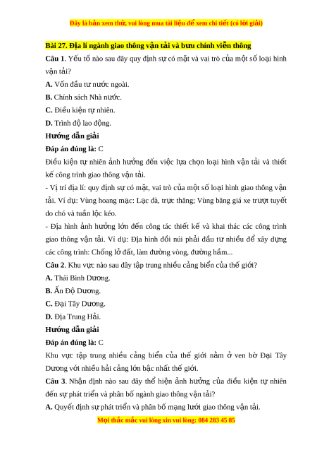 Đây là bản xem th , vu ử i lòng mua tài li u ệ đ xe ể m chi ti t ế (có l i ờ gi i ả ) Câu 6. Như c đi ợ m ể l n ớ nhất c a ủ ngành đư ng ôt ờ ô là A. tình tr ng ạ t t ắ ngh n gi ẽ ao thông vào gi cao đi ờ m ể . B. gây ra nh ng v ữ ấn đ nghi ề êm tr ng v ọ m ề ôi trư ng. ờ C. thi u ch ế ỗ đ u xe. ậ D. đ an t ộ oàn ch a ư cao. Hư ng ớ d n gi ẫ i ả Đáp án đúng là: B Như c ợ đi m ể l n ớ nh t ấ c a ủ ngành đư ng ờ ôtô là gây ra nh ng ữ v n ấ đề nghiêm tr ng ọ v m ề ôi trư ng, đ ờ c bi ặ t ệ là ô nhi m ễ môi trư ng. ờ Câu 7. Đ đ ể ẩy m nh phát ạ tri n ki ể nh t - ế xã h i ộ m ở i n núi ề c s ơ h ở t ạ ng đ ầ u ầ tiên cần chú ý là A. xây d ng m ự ng ạ lư i ớ y t , gi ế áo d c, an ni ụ nh. B. cung cấp lao đ ng ộ và lư ng t ơ h c, t ự h c ự ph m ẩ . C. m r ở ng di ộ ện tích tr ng r ồ ng, r ừ ng t ừ nhi ự ên. D. phát tri n nhanh ể các tuy n gi ế ao thông v n ậ t i ả . Hư ng ớ d n gi ẫ i ả Đáp án đúng là: D Để đ y ẩ m nh ạ phát tri n ể kinh tế - xã h i ộ ở mi n ề núi cơ sở hạ t ng ầ đ u ầ tiên cần chú ý là phát tri n ể nhanh các tuy n ế giao thông v n ậ t i ả . Giao thông v n ậ t i ả giúp giao l u ki ư nh t gi ế a các ữ vùng, mi n ề và các đ a ph ị ư ng. ơ Câu 8. Nh n đ ậ