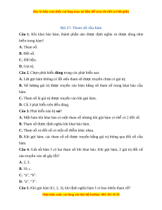 Câu 1. Khi khai báo hàm, thành ph n ầ nào đư c ợ đ nh ị nghĩa và đư c ợ dùng như bi n t ế rong hàm? A. Tham số. B. Đ i ố số. C. Dữ li u. ệ D. Giá tr . ị Câu 2. Ch n ọ phát bi u