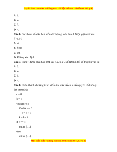Câu 6. Các tham số c a ủ f có ki u ể d l ữ i u gì ệ n u hàm ế f đư c ợ g i ọ nh s ư au: f( ‘5.0’) A. str B. float. C. int. D. Không xác đ nh. ị Câu 7. Hàm f đư c ợ khai báo nh s ư au f(a, b, c). S l ố ư ng ợ đ i ố s t ố ruy n vào l ề à: A. 3. B. 2. C. 1. D. 4.