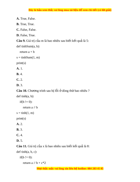 Đây là bản xem th , vu ử i lòng mua tài li u ệ đ xe ể m chi ti t (c ế ó l i ờ gi i ả ) A. True, False. B. True, True. C. False, False. D. False, True. Câu 9. Giá tr c ị a m ủ là bao nhiêu sau bi t ế k t ế qu l ả à 5: def tinhSum(a, b): return a + b s = tinhSum(1, m) print(s) A. 1. B. 4. C. 2. D. 3. Câu 10. Chư ng t ơ rình sau bị l i ỗ ở dòng th bao nhi ứ êu ? def tinh(a, b): if(b != 0): return a // b s = tinh(1, m) print(s) A. 2. B. 3. C. 4. D. 5. Câu 11. Giá tr c ị a x l ủ à bao nhiêu sau bi t ế k t ế qu l ả à 8: def tinh(a, b, c): if(b != 0): return a // b + c*2 M i