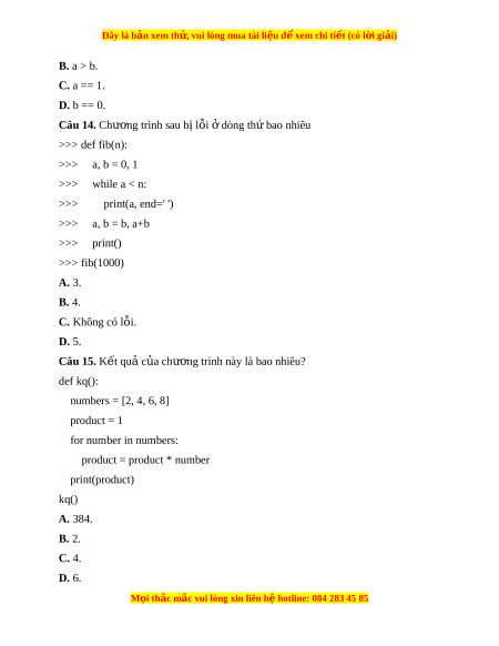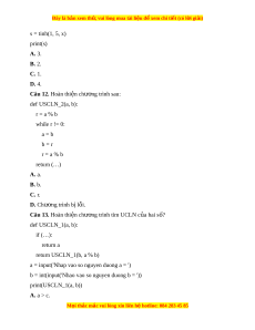 Đây là bản xem th , vu ử i lòng mua tài li u ệ đ xe ể m chi ti t (c ế ó l i ờ gi i ả ) s = tinh(1, 5, x) print(s) A. 3. B. 2. C. 1. D. 4. Câu 12. Hoàn thi n ch ệ ư ng ơ trình sau: def USCLN_2(a, b): r = a % b while r != 0: a = b b = r r = a % b return (…) A. a. B. b. C. r. D. Chư ng t ơ rình b l ị ỗi. Câu 13. Hoàn thi n ch ệ ư ng ơ trình tìm UCLN c a ủ hai s ? ố def USCLN_1(a, b): if (…): return a return USCLN_1(b, a % b)