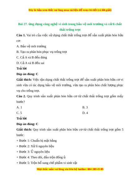 Bài 27. ứng d ng công ngh ụ vi ệ sinh trong b o v ả m ệ ôi trư ng và x ờ l ử í ch t ấ thải tr ng t ồ r t ọ Câu 1. Vai trò c a ủ vi c ệ sử d ng ụ ch t ấ th i ả tr ng ồ tr t ọ để s n ả xu t ấ phân bón h u ữ c : ơ A. B o v ả ệ môi trư ng ờ B. T o r ạ a phân bón ph c v ụ ụ trồng tr t ọ C. Cả A và B đ u đúng ề D. C ả A và B đ u s ề ai Trả l i ờ Đáp án đúng: C