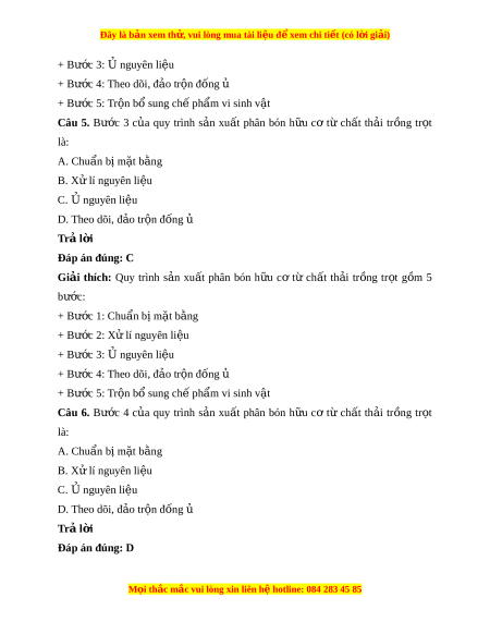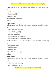 Giải thích: Việc t n ậ d ng ụ ch t ấ th i ả tr ng ồ tr t ọ để s n ả xu t ấ phân bón h u ữ c ơ vi sinh v a ừ có tác d ng ụ b o ả vệ môi trư ng, ờ v a ừ t o ạ ra phân bón ch t ấ lư ng ợ ph c ụ v cho ụ trồng tr t ọ . Câu 2. Quy trình s n ả xu t ấ phân bón h u ữ cơ từ ch t ấ th i ả tr ng ồ tr t ọ g m ồ m y ấ bư c ớ ? A. 1 B. 3 C. 5 D. 4 Trả l i ờ Đáp án đúng: C