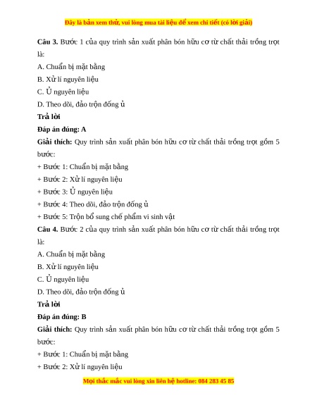 Đây là bản xem th , vu ử i lòng mua tài li u ệ đ xe ể m chi ti t (c ế ó l i ờ gi i ả ) Câu 3. Bư c ớ 1 c a ủ quy trình s n ả xu t ấ phân bón h u ữ cơ từ ch t ấ th i ả tr ng ồ tr t ọ là: A. Chuẩn b m ị t ặ b ng ằ B. X l ử í nguyên li u ệ C. nguyên l Ủ i u ệ D. Theo dõi, đ o ả tr n ộ đ ng ố ủ Trả l i ờ Đáp án đúng: A