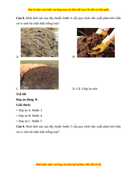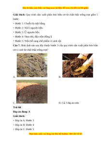 ổ sung chế phẩm vi sinh v t ậ Câu 7. Hình nh ả nào sau đây thu c ộ bư c ớ 3 c a ủ quy trình s n ả xu t ấ phân bón h u ữ cơ vi sinh t ch ừ t ấ th i ả tr ng t ồ r t ọ ? A. B. C. D. C 3 đáp án ả trên Trả l i ờ Đáp án đúng: A Giải thích: + Đáp án A: Bư c ớ 3 + Đáp án B: Bư c ớ 4 + Đáp án C: Bư c ớ 5 M i