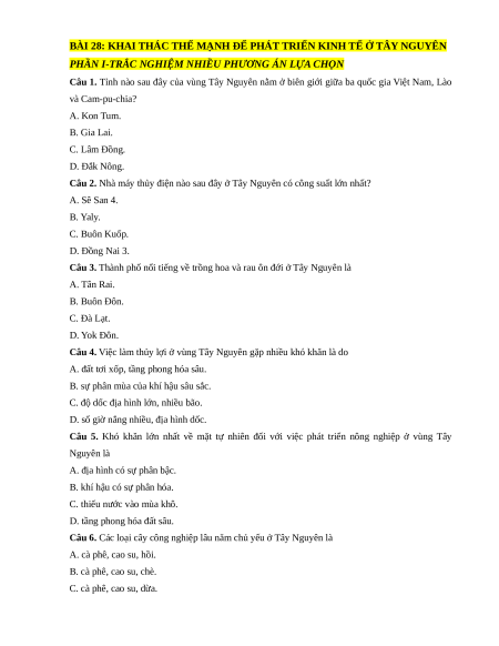 Câu 1. Tỉnh nào sau đây của vùng Tây Nguyên nằm ở biên giới giữa ba quốc gia Việt Nam, Lào và Cam-pu-chia? A. Kon Tum. B. Gia Lai. C. Lâm Đồng. D. Đắk Nông.