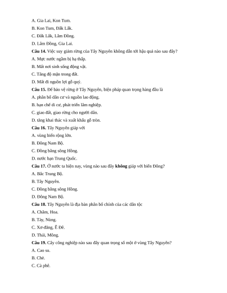 Câu 16. Tây Nguyên giáp với A. vùng biển rộng lớn. B. Đông Nam Bộ.
