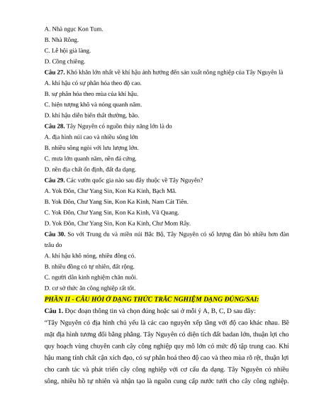 Trắc nghiệm Bài 28: Khai thác thế mạnh để phát triển kinh tế ở Tây Nguyên Địa lí 12 Đúng-Sai, Trả lời ngắn sách mới 2025