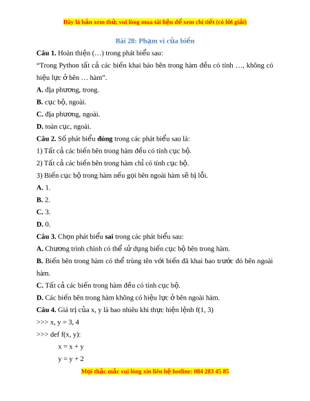 Đây là bản xem th , vu ử i lòng mua tài li u ệ đ xe ể m chi ti t (c ế ó l i ờ gi i ả ) Bài 28: Ph m ạ vi c a bi ủ n ế Câu 1. Hoàn thi n ( ệ …) trong phát bi u s ể au: “Trong Python t t ấ cả các bi n