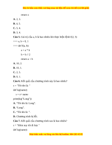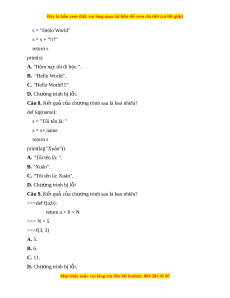 Đây là bản xem th , vu ử i lòng mua tài li u ệ đ xe ể m chi ti t (c ế ó l i ờ gi i ả ) return x A. 2, 3. B. 4, 5. C. 5, 4. D. 3, 4. Câu 5. Giá tr c ị a a, b l ủ à bao nhiêu khi th c hi ự n l ệ nh f ệ (2, 5) >>> a, b = 0, 1 >>> def f(a, b): a = a * b b = b // 2 return a + b A. 10, 2. B. 10, 1. C. 2, 5. D. 0, 1. Câu 6. K t ế quả c a ch ủ ư ng t ơ rình này là bao nhiêu? s = "Tôi tên là: " def kq(name): s = s+ name print(kq("Long"))