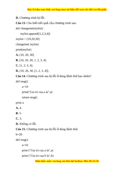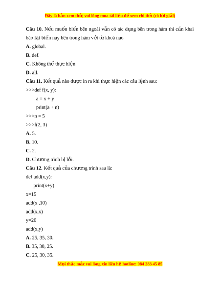 Đây là bản xem th , vu ử i lòng mua tài li u ệ đ xe ể m chi ti t (c ế ó l i ờ gi i ả ) Câu 10. N u ế muốn bi n ế bên ngoài v n ẫ có tác d ng ụ bên trong hàm thì c n ầ khai báo l i ạ bi n này bên t ế rong hàm v i ớ t khoá nào ừ A. global. B. def. C. Không th t ể h c ự hi n ệ D. all. Câu 11. K t ế quả nào đư c ợ in ra khi th c ự hi n các ệ câu l nh s ệ au: >>>def f(x, y): a = x + y print(a + n) >>>n = 5 >>>f(2, 3) A. 5. B. 10. C. 2. D. Chư ng t ơ rình b l ị ỗi. Câu 12. K t ế quả c a ch ủ ư ng t ơ rình sau là: def add(x,y): print(x+y) x=15 add(x ,10) add(x,x) y=20 add(x,y) A. 25, 35, 30. B. 35, 30, 25. C. 25, 30, 35. M i
