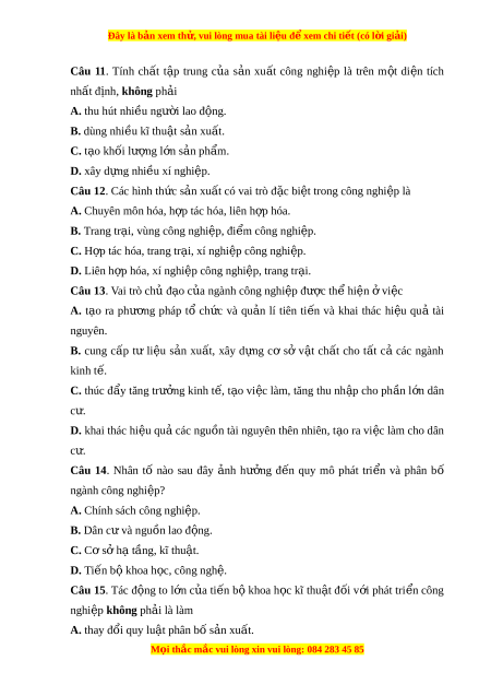 Đây là bản xem th , vu ử i lòng mua tài li u ệ đ xe ể m chi ti t ế (có l i ờ gi i ả ) Câu 11. Tính ch t ấ t p ậ trung c a ủ s n ả xu t ấ công nghi p ệ là trên m t ộ di n ệ tích nh t ấ đ nh, ị không ph i ả A. thu hút nhi u ng ề ư i ờ lao đ ng. ộ B. dùng nhi u kĩ ề thu t ậ s n ả xu t ấ . C. t o kh ạ ối lư ng l ợ n s ớ n ph ả m ẩ . D. xây d ng nhi ự u xí ề nghiệp.