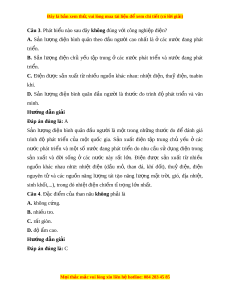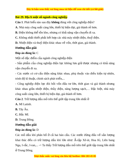 ậ , chính sách phát tri n,... ể - Công nghi p ệ đi n ệ l c ự đòi h i ỏ v n ố đ u ầ tư l n, ớ th i ờ gian và giá thành nh ng ư khác nhau gi a ữ nhi t ệ đi n, ệ th y ủ đi n, ệ năng lư ng ợ s ch,… ạ Đ c ặ bi t ệ , nhà máy công suất càng l n, t ớ hi t ế bị hi n đ ệ i ạ , giá thành r h ẻ n. ơ Câu 2. Tr l ữ ư ng d ợ ầu m t ỏ rên th gi ế i ớ t p ậ trung l n nh ớ t ấ ở A. Mĩ Latinh. B. Tây Âu. C. B c M ắ ĩ. D. Trung Đông. Hư ng d ớ ẫn gi i ả Đáp án đúng là: D Các mỏ d u